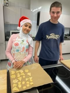 Zur Freude und Feier des Weihnachtsfestes dürfen natürlich leckere Plätzchen nicht fehlen, die von den Schülerinnen und Schülern gemeinsam mit den Kindern gebacken wurden – vorbereitet und angeleitet durch die Lehrkraft Jacqueline Grabenberg. Um die Leckereien mit nach Hause nehmen zu können, hatte Lehrerin Miriam Tasche mit den Schülerinnen und Schülern ein Angebot zum Herstellen eigener Sticker zum Verzieren von selbst gemachten Tüten bereitgestellt. Mit von den Kindern kunstvoll und reich verzierten Keksen im Gepäck ging es dann im Flieger vom warmen Israel wieder zurück ins winterliche Burg. Mit hoffentlich viel Weihnachtsfreude im Herzen.